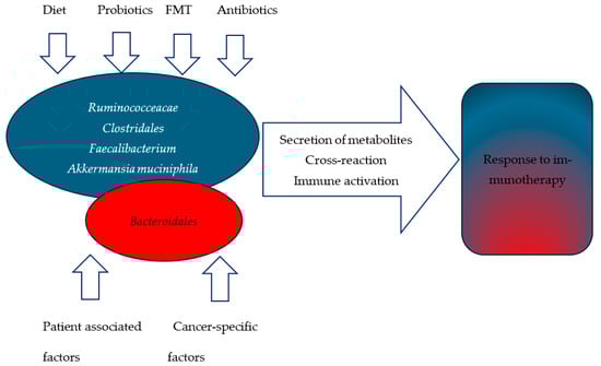 The composition of the intestinal microbiota of each person is kept in relative homeostasis, but it is variable depending on factors such as diet, environment, lifestyle, diseases, and drugs, especially antibiotics [1]. Modern research on the relationship between intestinal microbiota and immunotherapy began in 2015, when it was noticed that mice with sterile guts exhibit a worse clinical response to cancer immunotherapy treatment than mice with a more diverse gut microbiome [7]. However, several subsequent studies have shown heterogeneous results related to the exact composition of the microbiota that promotes the effectiveness of immunotherapy, and the results only partially overlap. The majority of studies highlight the genus Ruminococceacae [8,9,10,11,12], order Clostridales [9,10,13], genus Faecalibacterium [9,12,13], and the bacterium Akkermansia muciniphila [10,14,15,16,17] as more represented in the groups that achieved a clinical response to immunotherapy (responder group—R). On the other hand, it was shown that Bacteroidales order was more represented in the groups of patients who did not achieve a clinical response (non-responder group—NR) [8,9,11,12,18]. One of the ways in which the microbiota can affect the effect of immunotherapy is through the secretion of metabolites of inosine, tryptophan, metabolites of bile acids, and short-chain fatty acids, which affect genetic and epigenetic regulation, tumor signaling pathways, DNA repair, and the metabolism of cells of the immune system [19]. Metabolites can be pro-tumorigenic, anti-tumorigenic, or even both, depending on the environment in which it is found inside the body [2,19]. Via the cross-reaction between the gut microbiota and the cells of the immune system, the intermediate functions of innate immune cells increase, the anti-tumor effect of adaptive immune cells strengthens and the immunogenicity of tumor cells amplifies. In this way, the intestinal microbiota can reprogram the tumor microenvironment and enhance the response to immunotherapy [20] (Figure 1).