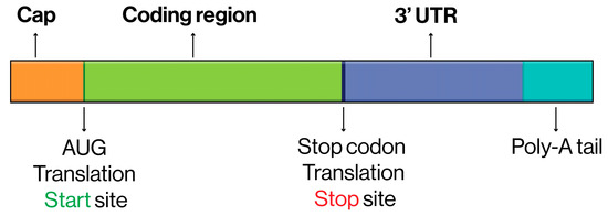 An mRNA therapeutic or vaccine product consists of several carefully designed components, each serving a specific function to ensure stability, efficient translation, and effectiveness. At the 5′ end, the cap structure (a modified guanosine nucleotide, m7G) protects the mRNA from degradation by exonucleases and facilitates ribosome binding for efficient translation initiation. Following the cap, the 5′ untranslated region (5′ UTR) regulates translation efficiency and mRNA stability by interacting with the ribosomal machinery. The coding sequence (CDS), which lies downstream of the 5′ UTR, encodes the protein of interest and begins with a start codon (AUG) and ends with a stop codon (UAA, UAG, or UGA), which signals the termination of translation. Codon optimization within the CDS ensures the use of codons preferred by the target organism to enhance protein synthesis rates. Beyond the coding sequence, the 3′ untranslated region (3′ UTR) plays a critical role in stabilizing the mRNA and modulating its half-life through interactions with regulatory proteins and microRNAs. At the 3′ end, the poly(A) tail—a series of adenine nucleotides—further protects the mRNA from degradation and facilitates interactions with poly(A)-binding proteins, which enhance translation and ribosome recycling. Additionally, modified nucleotides, such as pseudouridine or 1-methylpseudouridine, are often incorporated throughout the mRNA sequence to reduce immune activation, improve stability, and increase translational efficiency. Some mRNA products also include regulatory elements, such as internal ribosome entry sites (IRES) or stabilizing secondary structures, in order to further optimize translation and stability. These sequence components, when combined with a compatible delivery vehicle such as lipid nanoparticles, create a highly adaptable and efficient platform for therapeutic and vaccine applications [34] (Figure 1).