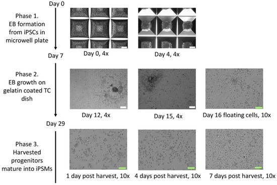 It is also possible to generate iPSMs from progenitors harvested on days 33 and thereafter. In this case, the time course for iPSM maturation for each plating is based on the days after progenitor plating. However, progenitor yield peaks at day 29, and we prefer to use only the first two progenitor harvests on days 29 and 33.