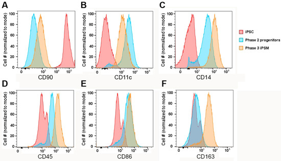 Expression of cell marker antigens in iPSCs, progenitors, and mature iPSMs ascertained by flow cytometry. X-axis, fluorescence intensity; Y-axis, normalized cell counts. (A–F) CD90, stem cell marker; CD11c, myeloid cell marker; CD14, myeloid marker; CD45 pan leukocyte marker; CD86, myeloid and B-cell marker; and CD163, macrophage-specific marker, respectively. Red, iPSCs; blue, macrophage progenitors; and orange, iPSMs. Forward and side scatter gating for these cells is shown in Supplemental Figure S1.