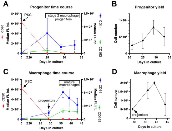 Time course and yield optimization of iPSM differentiation. (A) Characterization of phase 2 macrophage progenitors. Five iPSC lines underwent differentiation for expression levels of the CD14 (monocyte cell marker), CD163 (macrophage marker) and CD90 (stem cell marker) at day 0 and 3 time points throughout phase 2 (at days 25, 29, and 33). (B) Quantification of phase 2 cell yield at days 21, 25, 29, and 33, using 5 iPSC lines. (C) Characterization of phase 3 iPSMs. Three iPSC lines underwent differentiation for expression levels of the CD14, CD163, and CD90 at days 0, 29 (at progenitor harvesting), 36, 39, and 43 (the latter 3 time points throughout phase 3 are 7, 10, and 14 days after progenitor harvesting). (D) Time-course of iPSM yield at 4 time points during phase 3 on the same 3 iPSC lines depicted in panel (C). All panels display mean + S.D.