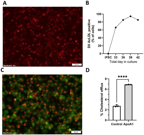 iPSMs display macrophage activities. (A) iPSMs uptake of DiI-labeled AcLDL, an assay for macrophage scavenger receptor-1. (B) % of DiI AcLDL loaded iPSMs by flow cytometry during phase 3 (4, 7, 10, and 13 days after day 29 progenitor harvesting). (C) Phagocytosis of pHrodo Red stained E. coli by iPSMs (membrane stained in green). (D) ApoA1-mediated cholesterol efflux from iPSMs. ****, p < 0.0001 by two-tailed t-test.