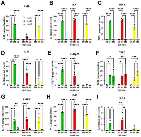 Cytokine release by iPSMs (M0) and polarized M1- and M2-like macrophages. Mature iPSMs (M0) of three iPSC lines (different symbols and colors) were treated with low-dose LPS (100 ng/mL) together with INFγ (20 ng/mL) for 24 h for the polarization to M1-like macrophages, or IL-4 (20 ng/mL) for 24 h for polarization to M2-like macrophages. The conditioned media of triplicate wells for each condition and cell line was collected for the assessment of multiple cytokines. (A–I) IL-1β, IL-6, TNFα, IL-10, IL-12p70, TARC, IL-1RA, IP-10, and IL-23 levels, respectively, released by M0, M1-and M2-like macrophages. * p < 0.05, ** p < 0.01, *** p < 0.001, **** p < 0.0001 by two-tailed ANOVA with Tukey’s posttest.