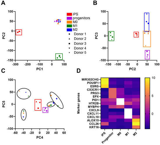 RNAseq of iPSCs, macrophage progenitors, and iPSMs from different iPS donors. (A–C) Principal component analysis for the first 5 principal components (PCs). Different cell types are shown in different colors and different donors are depicted by different shaped symbols. Colored rectangular frames represent clustering by cell type, and black oval frames represent a clustering of M0, M1- and M2-like iPSMs by the donor. (D) Marker genes for the 5 cell types were identified from RNAseq based on log2 fold change for the selected cell type vs. the other cell types. The color bar shows log2 counts per million, with values >10 shown in white.