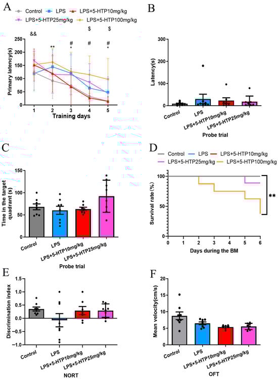 Effect of 5-HTP on cognitive behavior and motor functions in LPS-induced SAE model. (A) Performance during learning pahse of BM between groups; * Control versus LPS; # LPS versus LPS + 5-HTP (10 mg/kg); & LPS versus LPS + 5-HTP (25 mg/kg); $ LPS versus LPS + 5-HTP (100 mg/kg). (B,C) Probe trial of BM across groups. (D) Survival rate during BM procedure. (E) NORT discrimination index across group. (F) Mean velocity in OFT across groups. * p < 0.05, ** p < 0.01, # p < 0.05, && p < 0.01, $ p < 0.05. BM, Barnes maze; NORT, New object recognition test; OFT, Open-field test.