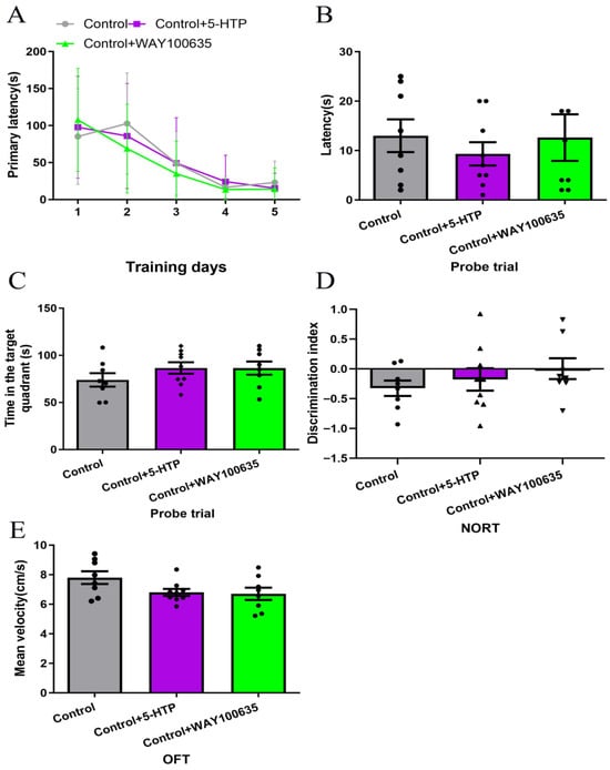 Our previous study found that WAY100635 (5-HT1A receptor antagonist, 1 mg/kg) blocked the cognitive-enhancing effects of fluoxetine (SSRI) [7]. In order to establish the specificity of 5-HTP (10 mg/kg) and WAY100635 (1 mg/kg) in modulating cognitive impairment in SAE, we first characterized their effects in healthy mice. No statistically significant differences were observed among the Control, Control + 5-HTP, and Control + WAY100635 groups in performance on the BM, NORT, or OFT (Figure 3). These findings indicate that administration of 5-HTP (10 mg/kg) and WAY100635 (1 mg/kg) does not significantly alter cognitive or motor functions in healthy mice at the doses tested.