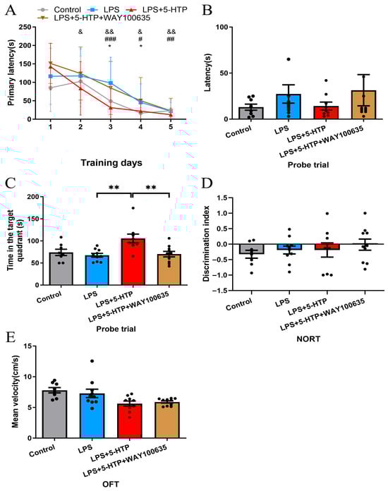 Impact of WAY100635 pretreatment on 5-HTP’s effects in LPS-induced SAE model. (A) Performance during learning phase of BM between groups; * Control versus LPS; # LPS versus LPS + 5-HTP; & LPS + 5-HTP versus LPS + 5-HTP + WAY100635. (B,C) Probe trial of BM across groups. (D) NORT discrimination index across group. (E) Mean velocity in OFT across groups. * p < 0.05, ** p < 0.01, # p < 0.05, ## p < 0.01, ### p < 0.001, & p < 0.05, && p < 0.01. BM, Barnes maze; NORT, New object recognition test; OFT, Open-field test.