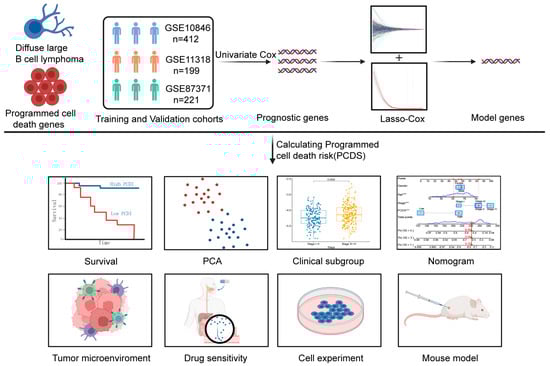 These non-apoptotic forms of PCD are increasingly appreciated not only for their roles in tumor progression and resistance but also for their profound impact on the tumor immune microenvironment. Several studies have demonstrated that activating these non-apoptotic PCD pathways can sensitize tumors to chemotherapy or immunotherapy. For example, ferroptosis is linked to lipid peroxidation and enhanced sensitivity to immune checkpoint blockade [,]. Pyroptosis can elicit robust anti-tumor immunity by releasing damage-associated molecular patterns (DAMPs), thereby attracting immune cells [,,]. Cuproptosis, a copper-dependent modality that targets lipoylated mitochondrial enzymes, has opened a new avenue for metabolic vulnerabilities in cancer []. More recently, disulfidptosis was identified as cytoskeletal collapse induced by disulfide stress, offering novel insights into redox regulation of cancer cell survival []. These discoveries, consolidated in recent comprehensive reviews [,,], highlight the therapeutic potential of modulating PCD pathways to enhance cancer immunotherapy. However, despite these advances, most mechanistic and translational studies have been confined to solid tumors, whereas the clinical and prognostic relevance of non-apoptotic PCD pathways in hematological malignancies remains poorly understood. DLBCL, the most common and heterogeneous subtype of non-Hodgkin lymphoma, exemplifies this knowledge gap. Conventional prognostic tools cannot fully capture the molecular complexity and immune heterogeneity of the disease. Given the increasing role of immunotherapy in DLBCL, there is an urgent need to investigate how diverse PCD pathways intersect with the tumor microenvironment (TME) to influence patient outcomes. Addressing this gap may provide novel biomarkers and therapeutic strategies tailored to the unique biology of DLBCL.