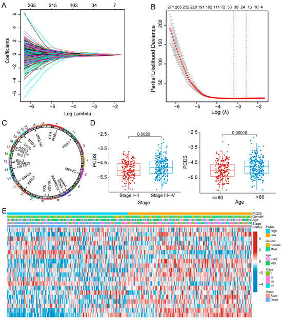 Identification of core model genes and clinical correlations with the PCDS in DLBCL patients. (A,B) LASSO regression analysis of 481 prognosis-associated genes from the GSE10846 dataset (n = 412). The cross-validation curve and lambda curves are shown, with the optimal λ value selected by the minimum partial likelihood deviance. (C) Genomic chromosomal distribution of the 20 genes incorporated into the PCDS model. (D) Distribution of PCDS values across clinical subgroups stratified by stage (I–II vs. III–IV) and age (<60 vs. ≥60 years). (E) Heatmap illustrating the association between the expression levels of the 20 model genes and major clinical features. Abbreviations: PCDS, programmed cell death score.