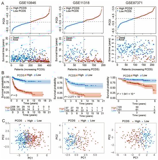 Validation of the prediction model using training and external datasets. (A) PCDS distribution over time and survival status in three independent GEO cohorts (GSE10846, n = 412; GSE11318, n = 199; GSE87371, n = 221). (B) Kaplan–Meier overall survival curves comparing high- and low-PCDS groups in the three cohorts. Survival differences were evaluated using the log-rank test. (C) PCA plots showing distinct separation of patients into high- and low-PCDS groups according to the expression profiles of the 20 model genes. Abbreviations: PCDS, programmed cell death score.