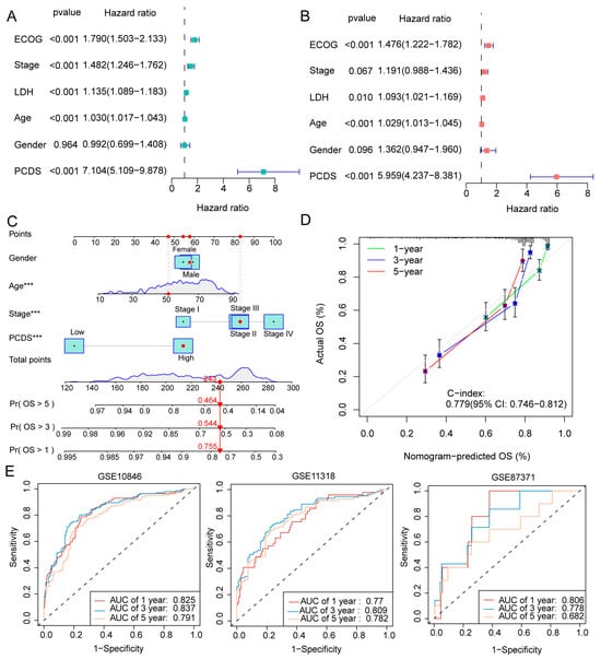 Development and evaluation of the nomogram-based survival model. (A,B) Univariate and multivariate Cox regression analyses of OS, including PCDS and established clinical variables (age, stage, LDH, ECOG, gender). Hazard ratios (HRs) with 95% CIs are displayed. (C) Nomogram constructed from PCDS and clinical parameters to predict 1-, 3-, and 5-year OS in DLBCL patients. (D) Calibration plots demonstrating the concordance between predicted and observed OS at 1, 3, and 5 years. (E) Receiver operating characteristic (ROC) curves showing the predictive performance of the nomogram in three independent cohorts (GSE10846, GSE11318, GSE87371). AUC values are reported for each time point. *** p < 0.001. Abbreviations: AUC, area under the curve; CI, confidence interval; C-index, concordance index; ECOG, Eastern Cooperative Oncology Group; HR, hazard ratio; LDH, lactate dehydrogenase; OS, overall survival; PCDS, programmed cell death score.