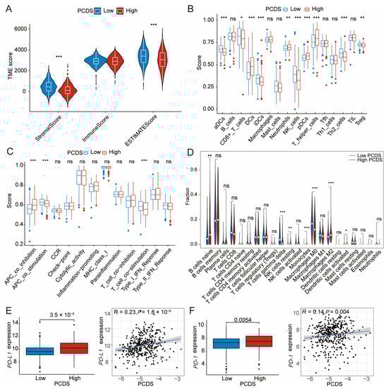 Tumor immune microenvironment analysis based on PCDS subgroups. (A) ESTIMATE algorithm-derived stromal and immune scores in high- vs. low-PCDS groups. (B) ssGSEA ImmCell infiltration analysis. (C) ssGSEA ImmFunction analysis. (D) CIBERSORT immune cell composition analysis. (E,F) Boxplots and correlation plots illustrating the positive association between PCDS values and the expression of immune checkpoint molecules PD-1 and PD-L1. ns, not significant; * p < 0.05; ** p < 0.01; *** p < 0.001. Abbreviations: PCDS, programmed cell death score; TME, tumor microenvironment; aDC, activated dendritic cell; APC, antigen-presenting cell; CCR, cytokine–cytokine receptor interaction; IFN, interferon; PD-1, programmed cell death protein 1; PD-L1, programmed cell death ligand 1.