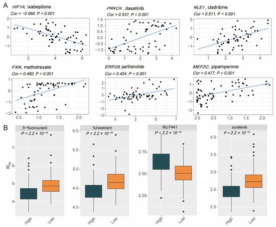 Correlations between drug sensitivity and PCDS. (A) Correlation matrix between the expression of individual PCDS model genes and predicted sensitivity to chemotherapeutic or targeted drugs. Drug sensitivity was assessed based on IC50 values estimated from the GDSC database using ridge regression models in the “oncoPredict” R package (v0.3.0). (B) Predicted drug sensitivity differences between high- and low-PCDS groups, showing significantly lower IC50 values for 5-fluorouracil, fulvestrant, and sorafenib in the high-PCDS subgroup and increased sensitivity to NU7441 in the low-PCDS subgroup. Comparisons were performed using the Wilcoxon rank sum test, with p < 0.05 considered statistically significant. Abbreviations: IC50, half maximal inhibitory concentration.
