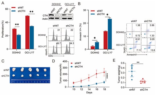 Currently, the impact of CTH in DLBCL remains unexplored. To bridge this gap, we conducted functional studies to evaluate its significance. First, Western blotting confirmed effective knockdown of CTH expression in DOHH2 and OCI-LY7 cell lines using shCTH compared to shNT (Figure 7A). EdU incorporation assays demonstrated that CTH knockdown significantly suppressed cell proliferation in both cell lines, indicating a key role of CTH in promoting DLBCL cell growth. In parallel, flow cytometry analysis of Annexin V/7-AAD-stained cells revealed markedly elevated levels of apoptosis in CTH-silenced cells, further supporting its pro-survival function (Figure 7B). To evaluate the in vivo relevance of CTH, we established a xenograft tumor model by subcutaneously injecting OCI-LY7 cells transduced with either shCTH or shNT into immunodeficient mice. Tumor growth was monitored over time, and the results showed that tumors formed by shCTH cells exhibited significantly reduced growth rates and final volumes compared to the control group (Figure 7C,D). Moreover, tumor weights at endpoint were significantly lower in the shCTH group, confirming the tumor-suppressive effect of CTH knockdown (Figure 7E). Together, these findings indicate that CTH acts as a functional driver in DLBCL by promoting tumor cell proliferation and inhibiting apoptosis and may be a potential target for DLBCL therapy.