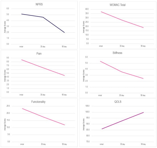 Descriptive statistics for the patient cohort, including mean, median, standard deviation, skewness, and kurtosis, were computed for baseline comparison. Patient-reported outcomes were measured using the NPRS, WOMAC (Pain, Stiffness, Physical Function subscales, and Total), and QOLS at initial and follow-up visits. The improvement was determined by calculating the percentage change from initial to 30-day and 90-day follow-ups. Nonparametric analysis was utilized to test for any statistical relevance in the improvement of scores over time using the Wilcoxon Signed Rank Test (WSRT) due to the small sample size and the data distribution. For each scale in the WSRT, three pairwise comparisons were tested. To control Type I error within each outcome, Bonferroni correction was applied within each family of three comparisons (adjusted α = 0.05/3 = 0.0167). Statistically significant differences were bolded in the tables below. Demographic factors such as age, BMI, and gender were tested to identify significance in overall total WOMAC score changes; however, age and gender were only included due to sample size and missing data in BMI. Potential confounders were adjusted with Bonferroni and bootstrapping. The correlation coefficient, r, was calculated only for significant values to indicate effect size. No imputation was performed. All statistical tests were two-tailed, with a significance threshold set at a 95% CI, p < 0.05 (except for WSRT). Although the cohort was divided by gender for comparison, no statistical analysis was performed due to insufficient sample size. Analyses were performed using SPSS Statistics (Version 30, IBM Corp, Armonk, NY, USA).