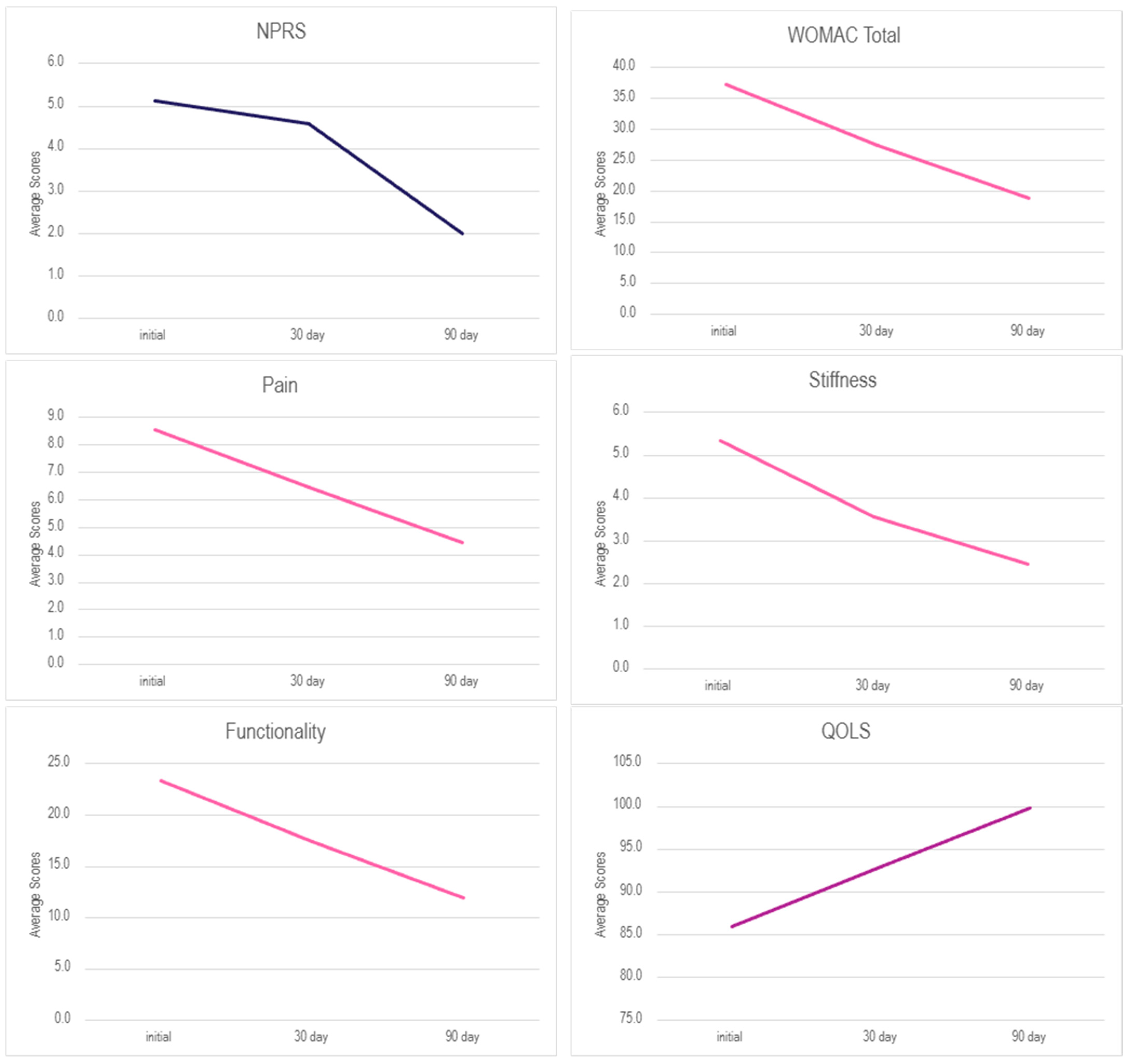 WOMAC Total | 4 | 48.25 | 4 | 36.25 | 4 | 26 | WOMAC Total | 5 | 28.4 | 5 | 20.4 | 5 | 13 |