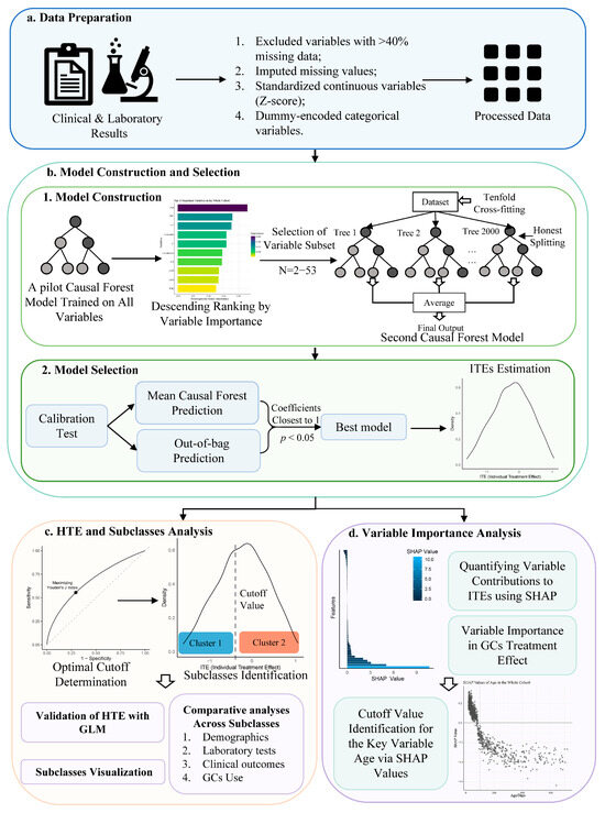 Overview of the Model Construction and Analysis Workflow. (a) Data Preparation: Clinical and laboratory results were collected for all patients. Variables with over 40% missing data were excluded, and missing laboratory data were imputed. Continuous variables were standardized using z-scores, while categorical variables were dummy coded. (b) Model Construction and Selection: (1) Model construction: A causal forest model trained on the all variables was built. Variable importance was assessed with the initial model, followed by ranking and selecting variables for a second causal forest model. The second model was constructed with 2000 trees, optimized through tenfold cross-validation. And the final model was selected by calibration tests. (2) Model selection: Calibration was evaluated using the best linear predictor for the true conditional average treatment effects. A well-calibrated model was indicated by a statistically significant coefficient near one for both the mean and differential prediction. The model with the best performance was selected as the final causal forest model. And the Individual treatment effects (ITEs) for GCs were calculated. (c) HTE and Subclass Analysis: Receiver operating characteristic curves were plotted, and optimal ITE cutoff values were identified using Youden’s J Index. Patients were grouped into two clusters based on ITEs, and multivariable generalized linear models were used to evaluate GC effects within each subclass, validating the heterogeneity of treatment effect among the patients. Additionally, comparative analyses across the subclasses were conducted. (d) Variable Importance Analysis: Shapley additive explanation values were computed to quantify the contribution of each variable to ITEs at the individual level. And the variable importance was calculated based on split occurrences in the causal forest model. Then the influence of age on the ITEs was analyzed separately to identify the cutoff value. Abbreviations: ITEs: individual treatment effects, HTE: the heterogeneous treatment effect, GLM: generalized linear model, GCs: glucocorticoids, SHAP: Shapley additive explanations.