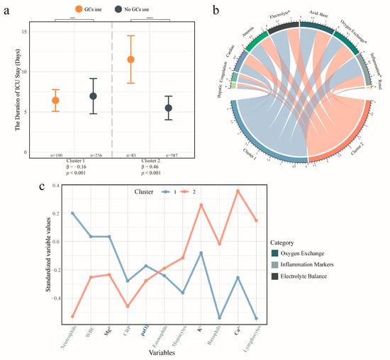 As shown in Figure 2a and Table 1, multivariable GLM analysis revealed a significant negative association between GC use and the duration of ICU stay in Cluster 1 (β = −0.16 log-days, p < 0.001) and a significant positive association in Cluster 2 (β = 0.46 log-days, p < 0.001), indicating that patients in Cluster 1 are more likely to benefit from GC therapy than those in Cluster 2. A similar pattern was identified for GC treatment intensity. Higher initial doses were associated with shorter ICU stays in Cluster 1 (β = −0.14 log-days, p < 0.001), but with longer stays in Cluster 2 (β = 0.34 log-days, p < 0.001).