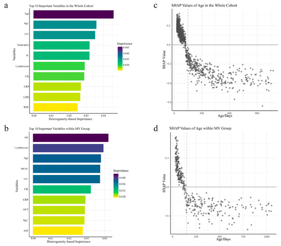 Since age was identified as a key variable in both the whole cohort and the MV group, the SHAP methodology was applied to evaluate its impact on the ITE for each patient. As shown in Figure 3c,d, age was inversely correlated with SHAP values. Patients older than 150 days exhibited negative SHAP values in both the whole cohort and the MV group, indicating that GC therapy was associated with a reduction in ICU stay and a shorter duration of MV in this age group.