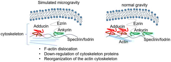 Schematic depicting effects of simulated microgravity on the actin cytoskeleton. The disassociation of f-actin [27], remodeling of the actin cytoskeleton [28], and downregulation of cytoskeleton proteins [29] by microgravity presumably alters the density and association of multiple actin associated proteins including ezrin, ankyrin, spectrin/fodrin, in specific cell types.