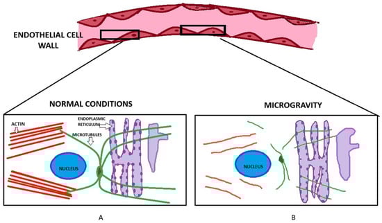 Changes in the structural integrity of endothelial cells from simulated microgravity. Box (A) shows a normal endothelial cell, under normal conditions and environment. The actin filaments (in red) and microtubules (green) are neatly arranged and maintain the structural support of the cells. Box (B) shows how the cytoskeleton of the endothelial cell changes after being in a simulated microgravity environment for 24 h. The actin filaments have decreased by about 65% which weakens the structural support of the cell. The microtubules are also visibly decreased and not maintaining its original shape [40]. This eventually causes increased permeability of cells.