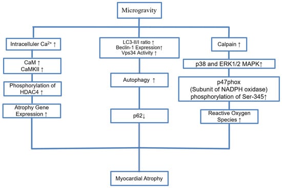 These findings and proposed therapies collectively emphasize that microgravity causes cardiac atrophy through converging but distinct molecular mechanisms such as oxidative stress, calcium dysregulation and autophagy. Although multiple pathways such as the CaMKII-HDAC4 axis, calpain activation and mitophagy have been implicated, studies looking at them all together are lacking. Future research goals should focus on taking a holistic view of the effects on cardiac and vascular tissue, prioritizing therapeutic targets and their adverse effects as well.