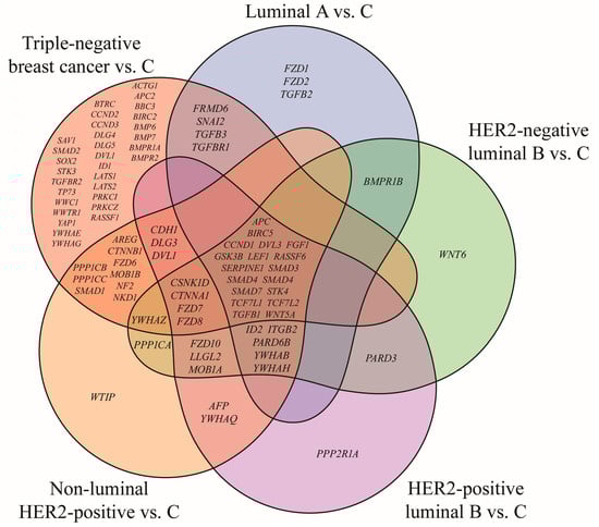 Venn diagram of Hippo pathway genes significantly altered in breast cancer subtypes compared with the control (p < 0.05; FC > 2 or < −2). HER2, human epidermal growth factor receptor 2; C, control; ACTG1, actin gamma 1; AFP, alpha fetoprotein; APC, APC regulator of WNT signaling pathway; APC2, APC regulator of WNT signaling pathway 2; AREG, amphiregulin; BBC3, BCL2 binding component 3; BIRC2, baculoviral IAP repeat containing 2; BIRC5, baculoviral IAP repeat containing 5; BMP6, bone morphogenetic protein 6; BMP7, bone morphogenetic protein 7; BMPR1A, bone morphogenetic protein receptor type 1A; BMPR1B, bone morphogenetic protein receptor type 1B; BMPR2, bone morphogenetic protein receptor type 2; BTRC, beta-transducin repeat containing E3 ubiquitin protein ligase; CCND1, cyclin D1; CCND2, cyclin D2; CCND3, cyclin D3; CDH1, cadherin 1; CSNK1D, casein kinase 1 delta; CTNNA1, catenin alpha 1; CTNNB1, catenin beta 1; DLG1, discs large MAGUK scaffold protein 1; DLG3, discs large MAGUK scaffold protein 3; DLG4, discs large MAGUK scaffold protein 4; DLG5, discs large MAGUK scaffold protein 5; DVL1, dishevelled segment polarity protein 1; DVL3, dishevelled segment polarity protein 3; FGF1, fibroblast growth factor 1; FRMD6, FERM domain containing 6; FZD1, frizzled class receptor 1; FZD2, frizzled class receptor 2; FZD3, frizzled class receptor 3; FZD4, frizzled class receptor 4; FZD6, frizzled class receptor 6; FZD7, frizzled class receptor 7; FZD8, frizzled class receptor 8; FZD10, frizzled class receptor 10; GSK3B, glycogen synthase kinase 3 beta; ID1, inhibitor of DNA binding 1; ID2, inhibitor of DNA binding 2; ITGB2, integrin subunit beta 2; LATS1, large tumor suppressor kinase 1; LATS2, large tumor suppressor kinase 2; LEF1, lymphoid enhancer binding factor 1; LLGL2, LLGL scribble cell polarity complex component 2; MOB1A, MOB kinase activator 1A; MOB1B, MOB kinase activator 1B; NF2, moesin-ezrin-radixin like (MERLIN) tumor suppressor; NKD1, NKD inhibitor of WNT signaling pathway 1; PARD3, par-3 family cell polarity regulator; PARD6B, par-6 family cell polarity regulator beta; PPP1CA, protein phosphatase 1 catalytic subunit alpha; PPP1CB, protein phosphatase 1 catalytic subunit beta; PPP1CC, protein phosphatase 1 catalytic subunit gamma; PPP2R1A, protein phosphatase 2 scaffold subunit Aalpha; PRKCI, protein kinase C iota; PRKCZ, protein kinase C zeta; RASSF1, Ras association domain family member 1; RASSF6, Ras association domain family member 6; SAV1, salvador family WW domain containing protein 1; SERPINE1, serpin family E member 1; SMAD1, SMAD family member 1; SMAD2, SMAD family member 2; SMAD3, SMAD family member 3; SMAD4, SMAD family member 4; SMAD7, SMAD family member 7; SNAI2, snail family transcriptional repressor 2; SOX2, SRY-box transcription factor 2; STK3, serine/threonine kinase 3; STK4, serine/threonine kinase 4; TCF7L1, transcription factor 7 like 1; TCF7L2, transcription factor 7 like 2; TGFB1, transforming growth factor beta 1; TGFB2, transforming growth factor beta 2; TGFB3, transforming growth factor beta 3; TGFBR1, transforming growth factor beta receptor 1; TGFBR2, transforming growth factor beta receptor 2; TP73, tumor protein p73; WNT5A, Wnt family member 5A; WNT6, Wnt family member 6; WTIP, WT1 interacting protein; WWC1, WW and C2 domain containing 1; WWTR1, WW domain containing transcription regulator 1; YAP1, Yes1 associated transcriptional regulator; YWHAB, tyrosine 3-monooxygenase/tryptophan 5-monooxygenase activation protein beta; YWHAE, tyrosine 3-monooxygenase/tryptophan 5-monooxygenase activation protein epsilon; YWHAG, tyrosine 3-monooxygenase/tryptophan 5-monooxygenase activation protein gamma; YWHAH, tyrosine 3-monooxygenase/tryptophan 5-monooxygenase activation protein eta; YWHAQ, tyrosine 3-monooxygenase/tryptophan 5-monooxygenase activation protein theta; YWHAZ, tyrosine 3-monooxygenase/tryptophan 5-monooxygenase activation protein zeta.