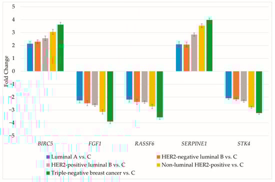 Expression profiling indicated upregulation of BIRC5 and SERPINE1 independent of breast cancer subtype. In contrast, FGF1, RASSF6 and STK4 exhibited significant downregulation in this cohort.