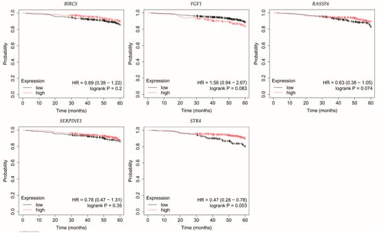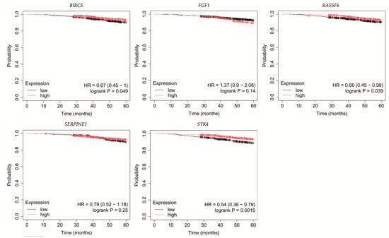 Overall survival of patients with HER2-negative luminal B breast cancer. BIRC5, baculoviral IAP repeat containing 5; FGF1, fibroblast growth factor 1; RASSF6, Ras association domain family member 6; SERPINE1, serpin family E member 1; STK4, serine/threonine kinase 4.