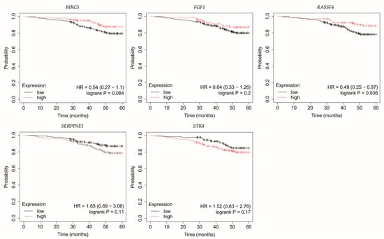 In luminal A breast cancer, reduced expression of RASSF6 and STK4 correlated with poorer OS (Figure 3). Similarly, for BIRC5, however, it should be noted that p was 0.049.