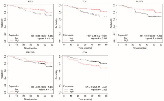 Overall survival of patients with HER2-positive luminal B breast cancer. BIRC5, baculoviral IAP repeat containing 5; FGF1, fibroblast growth factor 1; RASSF6, Ras association domain family member 6; SERPINE1, serpin family E member 1; STK4, serine/threonine kinase 4.
