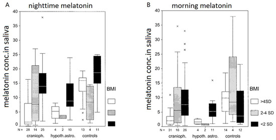 Salivary melatonin concentrations at nighttime (A) and in the morning (B) in patients with childhood craniopharyngioma, hypothalamic pilocytic astrocytoma, and controls in relation to the degree of obesity (body mass index (BMI) < 2 SD (filled black boxes), BMI 2–4 SD (hatched gray boxes], or BMI ≥ 4 SD (open boxes)). The horizontal line in the middle of the box depicts the median. Edges of the box mark the 25th and 75th percentile. Whiskers indicate the range of values that fall within 1.5 box lengths. Values more than 1.5 box length from the 25th and 75th percentiles are marked by an asterisk. (Reproduced from Müller et al., J Clin Endocrinol Metab, 2002 [36], with the kind permission of Endocrine Press). Abbreviations: cranioph., craniopharyngioma; hypoth. astro., hypothalamic astrocytoma; conc., concentration.