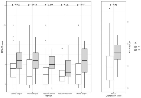 Boxplots showing multidimensional fatigue inventory (MFI)-20 scores of different domains (left) and overall sum score (right) in patients without (n = 16; white boxes) and with hypothalamic syndrome (HS) (n = 25; gray boxes). The horizontal line in the middle of the box depicts the median. The top and bottom edges of the box respectively mark the 25th and 75th percentiles. Whiskers indicate the range of values that fall within 1.5 box lengths. Outliers are indicated as dots. p values are retrieved from Student’s t-test. (Reproduced from Beckhaus et al., EJC Pediatric Oncology, 2024, [109] (with kind permission of Elsevier).