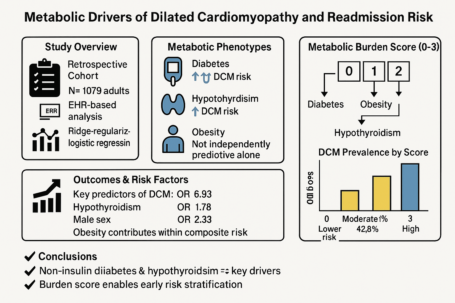 These findings support a more nuanced and interdisciplinary approach to cardiovascular risk assessment. Routine cardiology evaluation of patients with diabetes and thyroid dysfunction may be warranted even in the absence of classic heart failure symptoms. Endocrinologists, cardiologists, and primary care providers should be aware of the compounded cardiac risk posed by coexisting metabolic disorders and consider joint screening strategies to identify patients at the highest risk of DCM and clinical decompensation. Incorporating composite metabolic indices into electronic health record alerts or care pathways could improve early detection and management of cardiomyopathy in high-risk populations. Incorporating the Metabolic Burden Score into EHR-based risk alerts may support earlier identification of DCM in high-risk endocrine profiles.