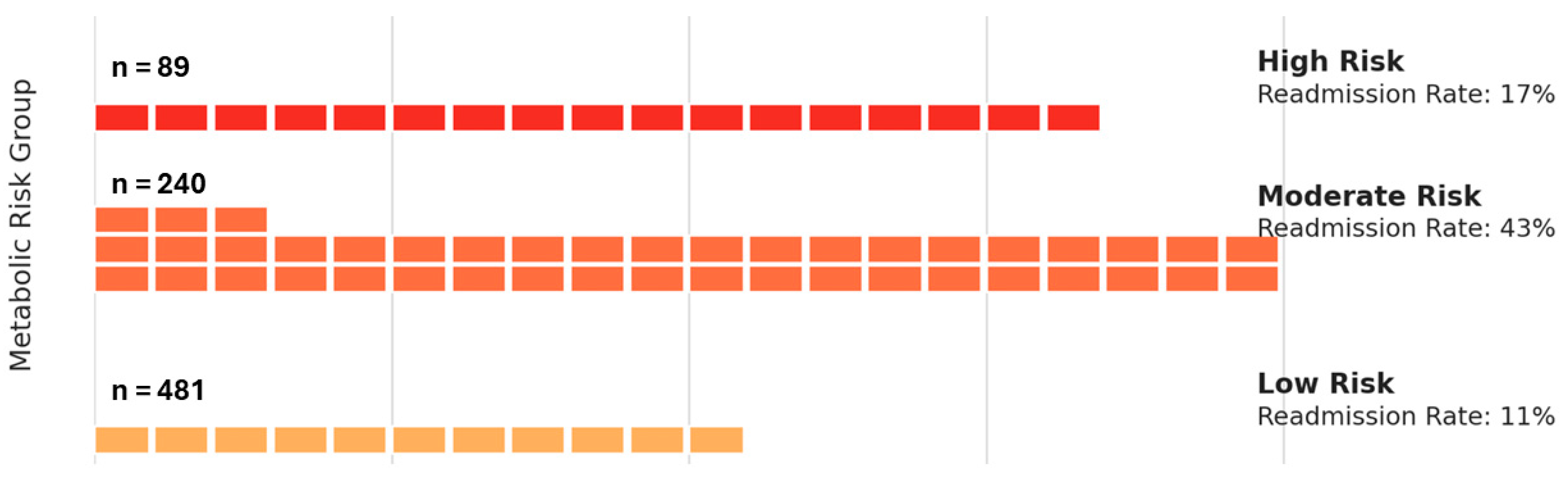 To visually compare short-term clinical instability across metabolic phenotypes, we constructed a waffle chart illustrating 30-day hospital readmission rates stratified by metabolic risk group. Risk categories were defined by the cumulative number of coexisting endocrine-metabolic conditions: Low Risk (one condition such as diabetes, obesity, or thyroid dysfunction), Moderate Risk (two conditions), and High Risk (all three). Each square (“brick”) in the chart represents approximately 1% of patients in that group who experienced a 30-day readmission. The number of filled squares reflects the observed readmission percentage: 11% for Low Risk, 43% for Moderate Risk, and 17% for High Risk. The horizontal axis denotes cumulative readmission percentage (0–100%), while the vertical grouping reflects risk stratification. This visual approach offers an intuitive comparison of post-discharge vulnerability across metabolic profiles, underscoring the disproportionately high early readmission rate among moderate-risk patients.