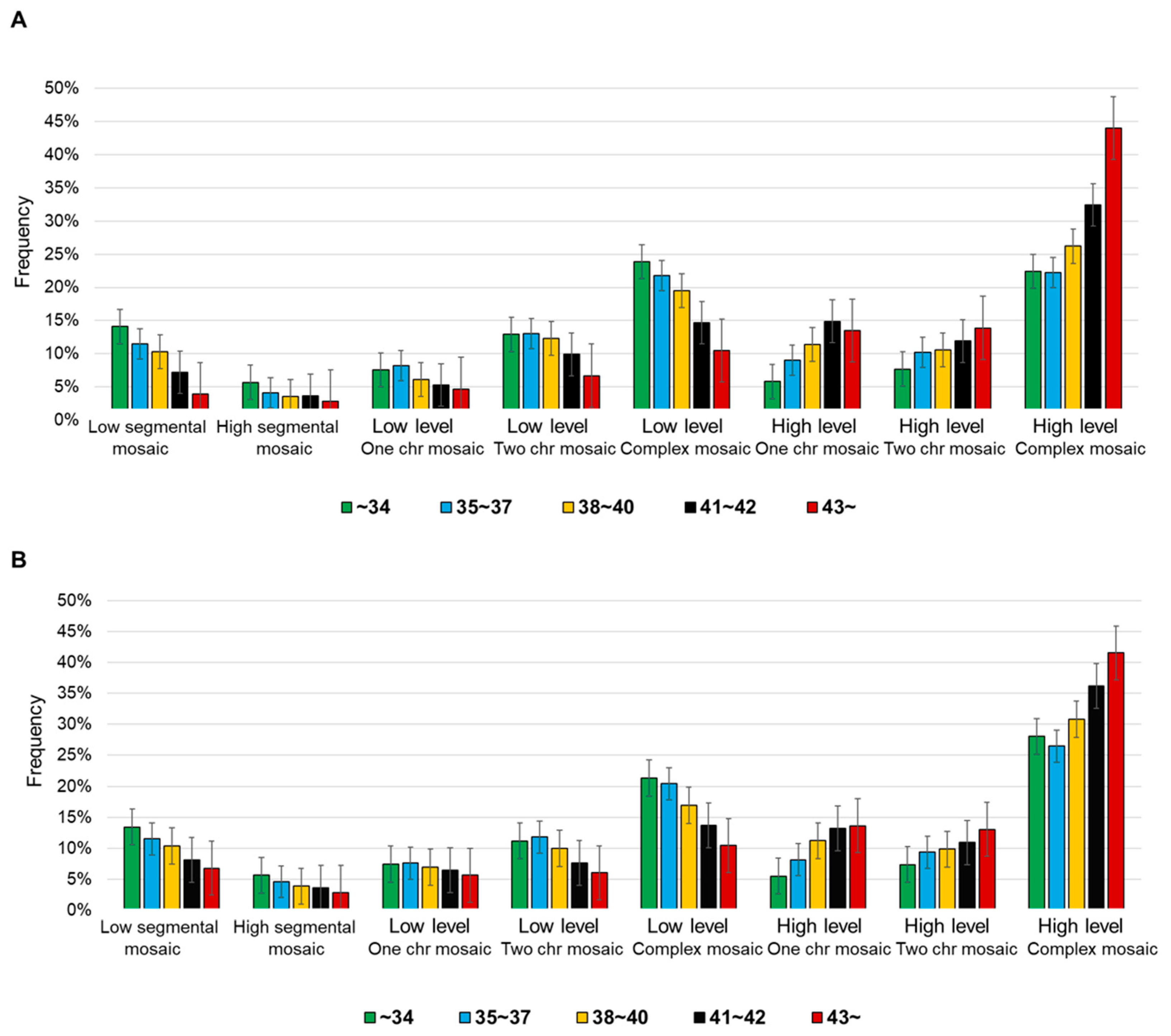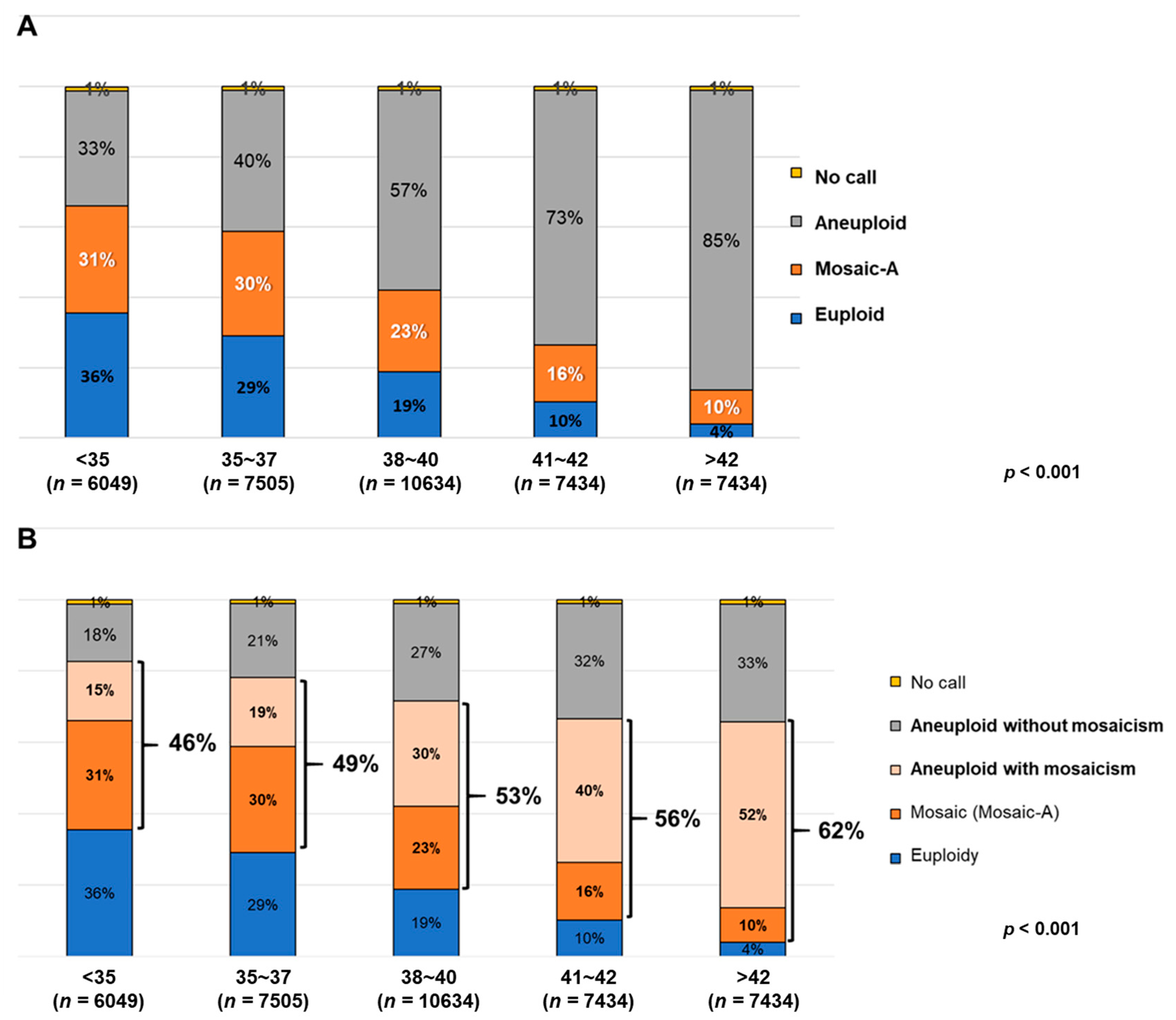 Aneuploid with mosaicism (Mosaic-B) | 30.2% (11,007) | 14.5% (877) (13.6~15.4%) | 19.3% (1449) (18.4~20.2%) | 29.6% (3143) (28.7~30.4%) | 40.2% (2989) (39.1~41.3%) | 52.2% (2549) (50.8~53.6%) | |