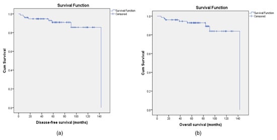 After a mean follow-up of 69.5 months (95% CI: 62.38–76.64), 5-year DFS and OS of the entire cohort were 92.1% and 93.4%, respectively (Figure 1).