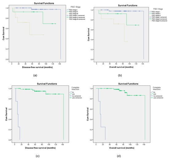 Kaplan–Meier curves for disease-free survival (DFS) and overall survival (OS) for the different stages of disease (a,b) and for complete or non-complete resection (c,d).
