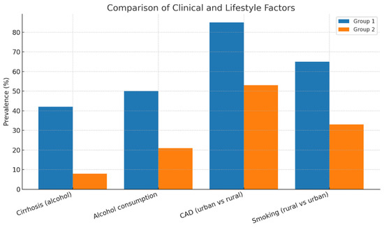 For the comparative analyses, patients were stratified into subgroups according to the specific factor under investigation [Figure 2]. For cirrhosis and alcohol consumption, the groups consisted of regular consumers versus non-consumers. For coronary artery disease, patients were divided according to residence (urban versus rural), whereas for smoking, the subgroups were defined as rural versus urban patients. The comparative prevalence of these factors is summarized in Table 2 and illustrated in Figure 2.