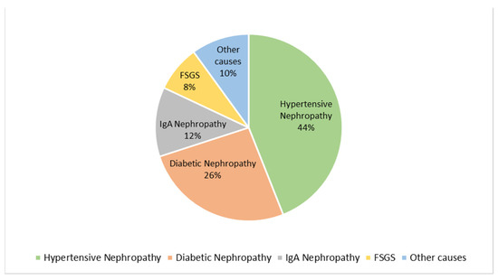 Baseline distribution of CKD etiologies among the first 50 patients included in the study. The most frequent cause was hypertensive nephropathy (44%), followed by diabetic nephropathy (26%), IgA nephropathy (12%), focal segmental glomerulosclerosis (FSGS, 8%), and other causes (10%).
