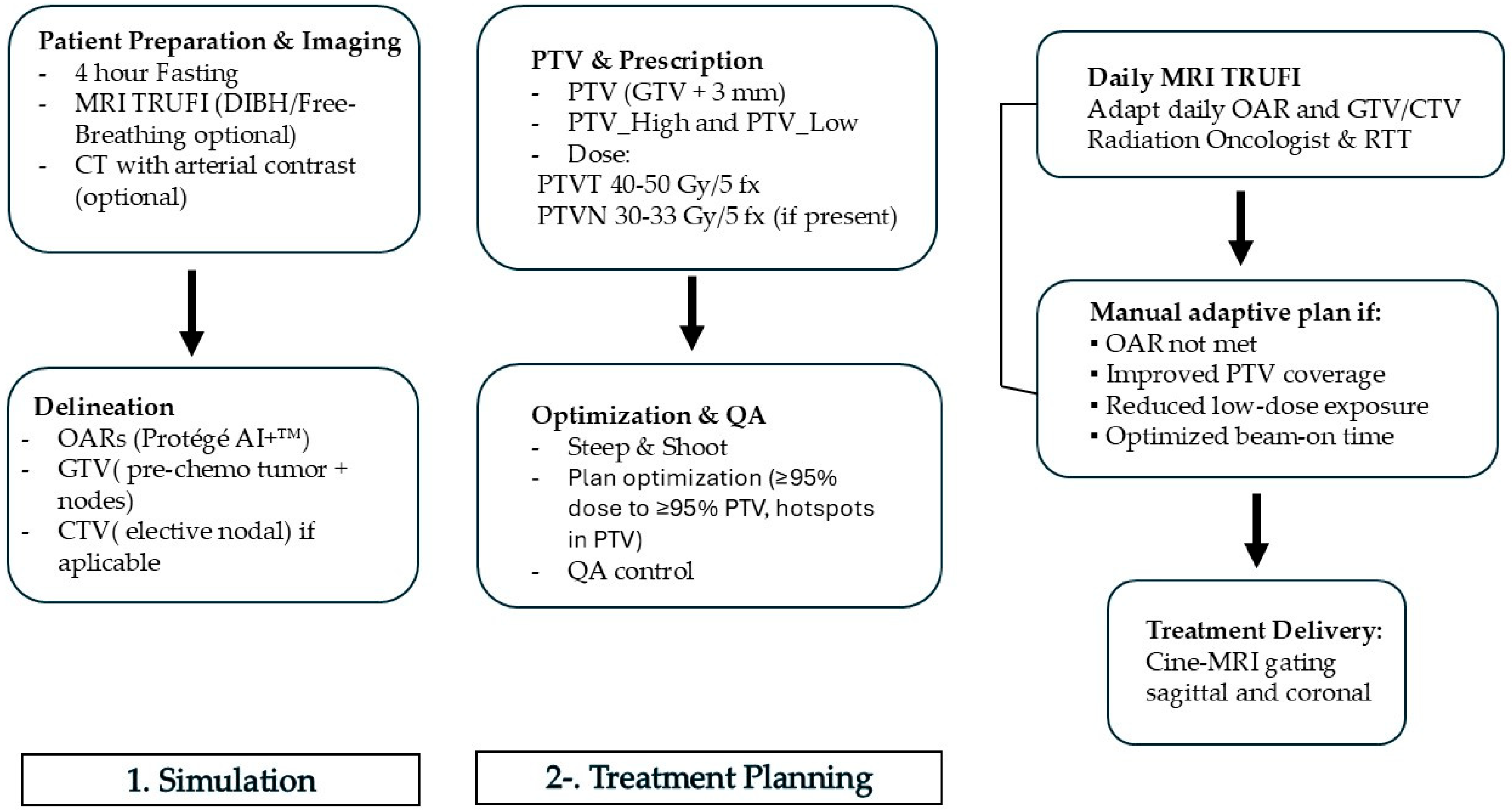 - Tringale, K.R.; Tyagi, N.; Reyngold, M.; Romesser, P.B.; Wu, A.; O’REilly, E.M.; Varghese, A.M.; Scripes, P.G.; Khalil, D.N.; Park, W.; et al. Stereotactic ablative radiation for pancreatic cancer on a 1.5 Tesla magnetic resonance-linac system. Phys. Imaging Radiat. Oncol. 2022, 24, 88–94. [Google Scholar] [CrossRef] [PubMed]