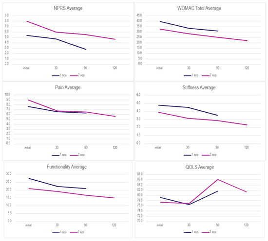 To understand the results, one must note that a lower NPRS and WOMAC score corresponds to positive change, but a higher QOLS score reflects improvement. Of the 26 initial patients, eighteen received a single application, and eight received two sequential applications. Both groups’ mean scores demonstrated a consistent reduction in the NPRS and WOMAC scores across all follow-up visits, regardless of the number of applications. The percent improvement from initial to last reported data set for each category is presented in Table 2. The single-application cohort reported overall score improvement in 5 out of 16 patients in NPRS scores and 12 out of 18 patients for total WOMAC and QOLS scores. For patients with two applications, overall score improvement was reported in 2 out of 3 patients in NPRS scores, 4 out of 8 patients in total WOMAC scores, and 7 out of 8 patients in QOLS scores.