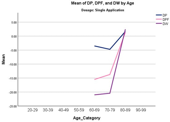 Line graph of median overall change in pain (DP), physical function (DPF), and total WOMAC (DW) scores across all age categories (20–29, 30–39, 40–49, 50–59, 60–69, 70–79, 80–89, 90–99) in the single-application group.