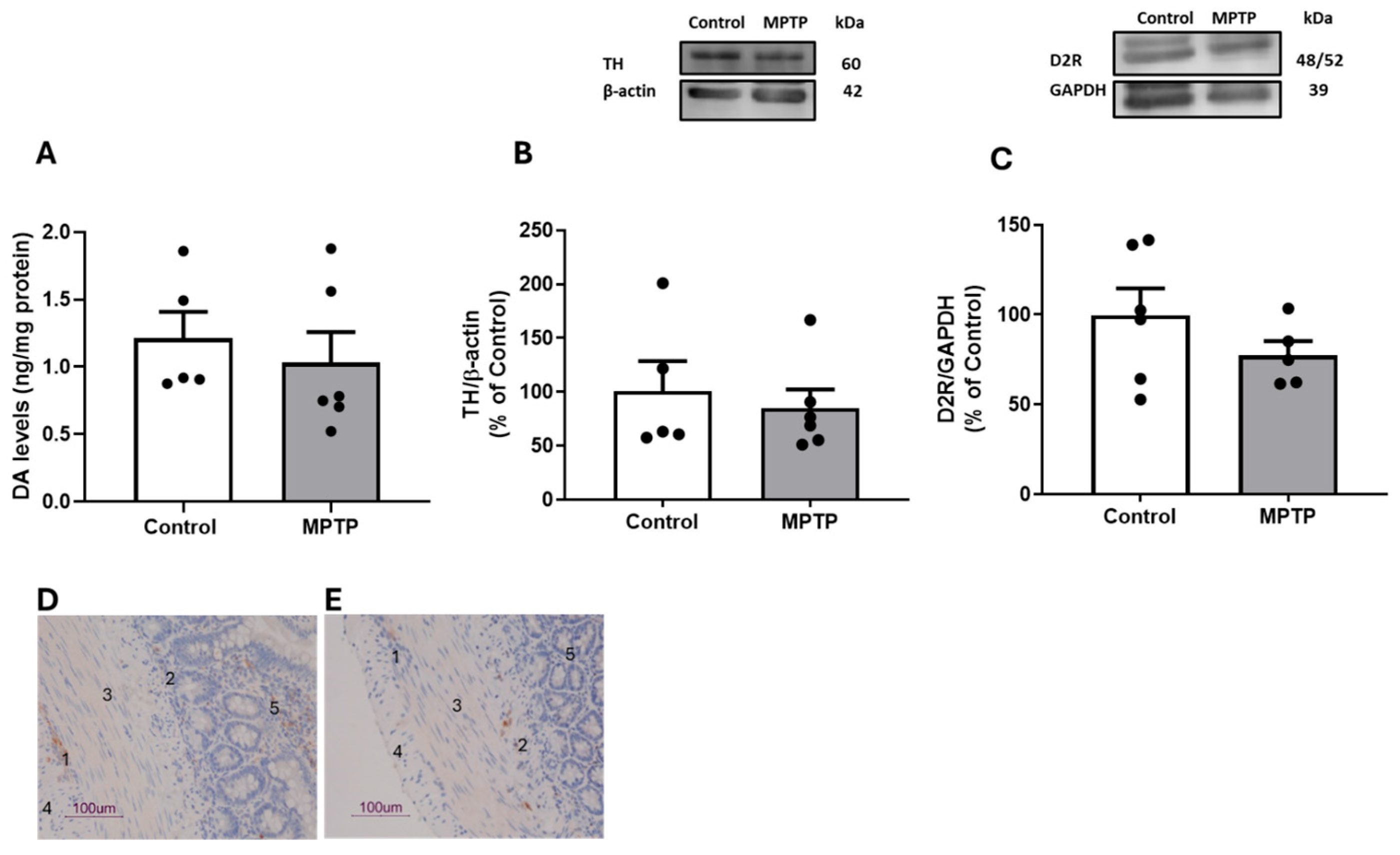 3.2. Dopaminergic and Gliosis Markers in Ilea of Rats Treated with Intranasal MPTP