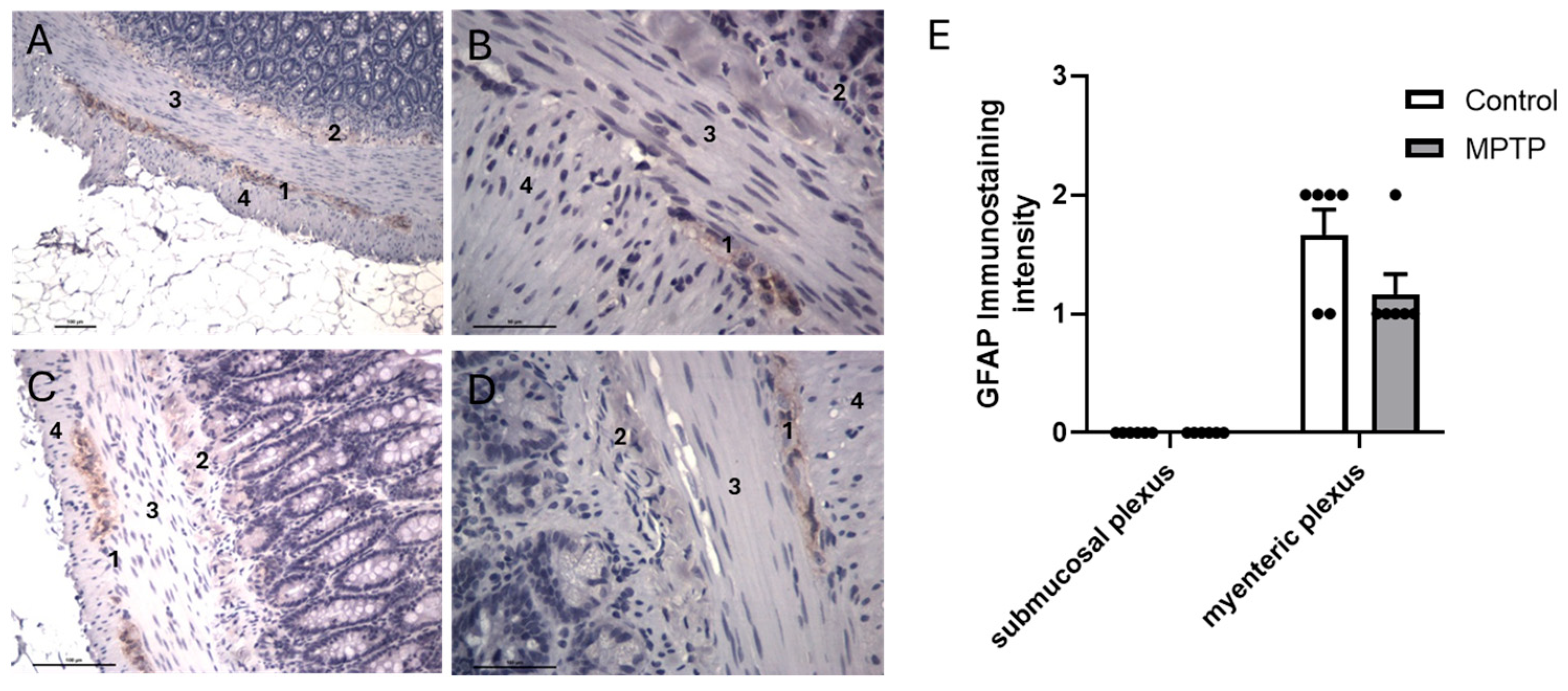 - Heng, Y.; Li, Y.Y.; Wen, L.; Yan, J.Q.; Chen, N.H.; Yuan, Y.H. Gastric Enteric Glial Cells: A New Contributor to the Synucleinopathies in the MPTP-Induced Parkinsonism Mouse. Molecules 2022, 27, 7414. [Google Scholar] [CrossRef] [PubMed]