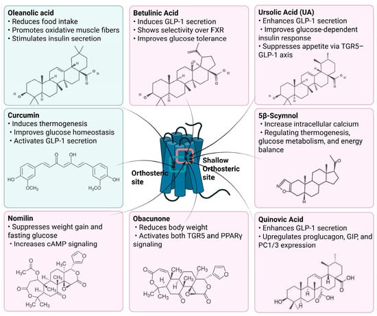 Schematic representation of natural products that activate TGR5 and modulate key metabolic processes relevant to obesity and related disorders. Each compound is shown with its chemical structure and primary metabolic effects, including GLP-1 secretion, thermogenesis, appetite suppression, glucose homeostasis, and energy expenditure. The central TGR5 receptor diagram highlights the orthosteric and shallow orthosteric binding sites. Compounds such as oleanolic acid, betulinic acid, ursolic acid, curcumin, 5β-scymnol, nomilin, obacunone, and quinovic acid engage TGR5 via diverse mechanisms and signaling pathways (e.g., cAMP, PKA, PPARγ, and GLP-1 axis), supporting their potential as therapeutic candidates for metabolic diseases.