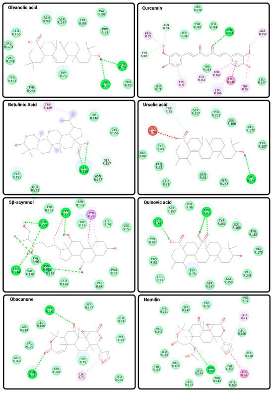 Predicted Binding Interactions Between Natural Compounds and TGR5. Molecular docking poses and binding interactions of eight natural compounds with the bile acid receptor TGR5 (PDB ID: 7BW0) were visualized using Discovery Studio Visualizer. Docking was performed using CB-Dock2, and ligand structures were obtained from PubChem in SDF format. Key binding interactions include conventional hydrogen bonds (bright green dashed lines), carbon hydrogen bonds (light green lines), and van der Waals interactions (light green shading), as well as hydrophobic contacts, including π–alkyl, alkyl, and amide–π stacking interactions (shaded pink and purple lines). The selected natural ligands include oleanolic acid, curcumin, betulinic acid, ursolic acid, 5β-scymnol, quinovic acid, obacunone, and nomilin. These compounds exhibit distinct binding profiles within the orthosteric region of TGR5, supporting their potential roles as modulators of TGR5 activity.
