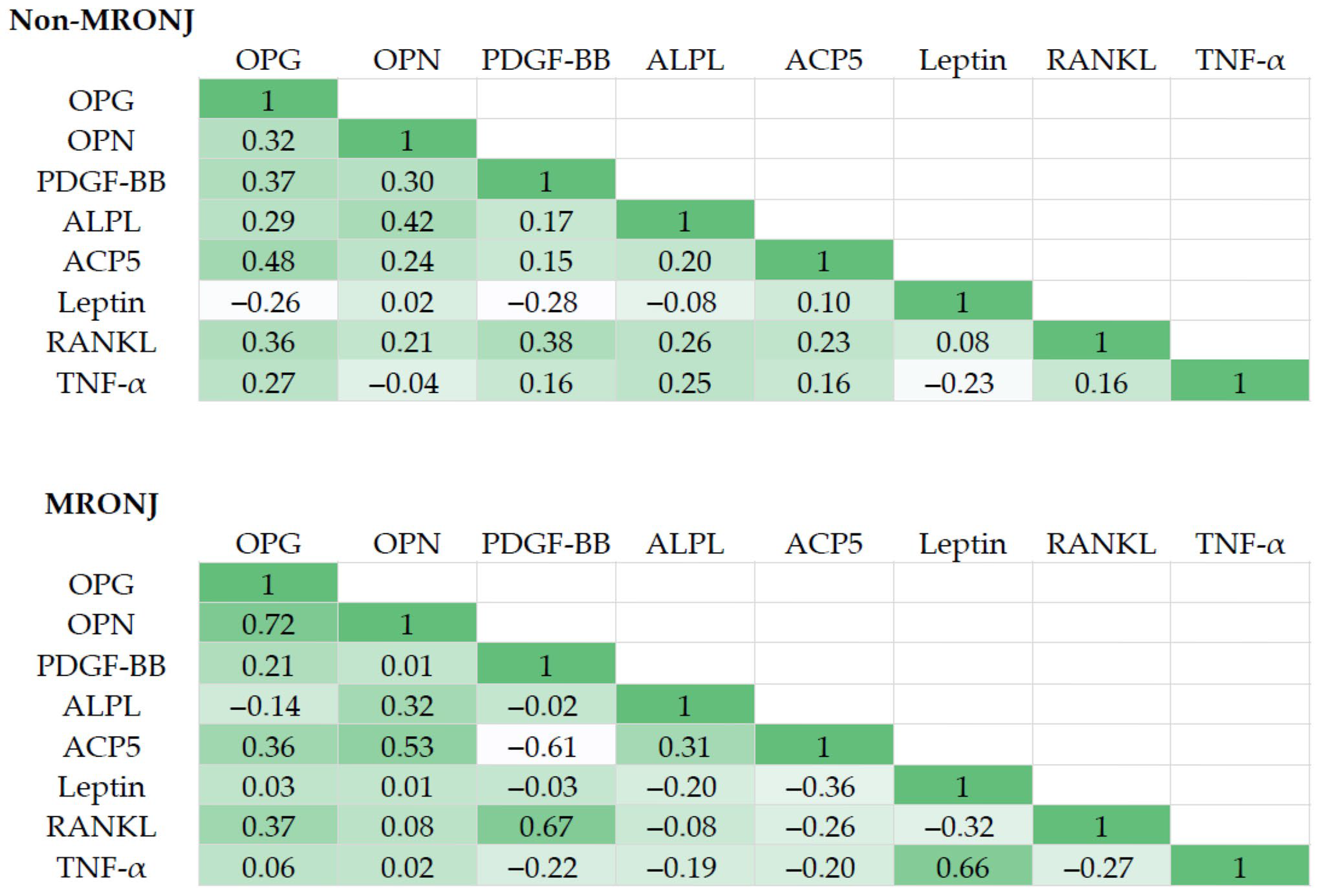 3.2. Inter-Correlation of Bone Metabolism Factors Associated with Osteonecrosis of the Jaw