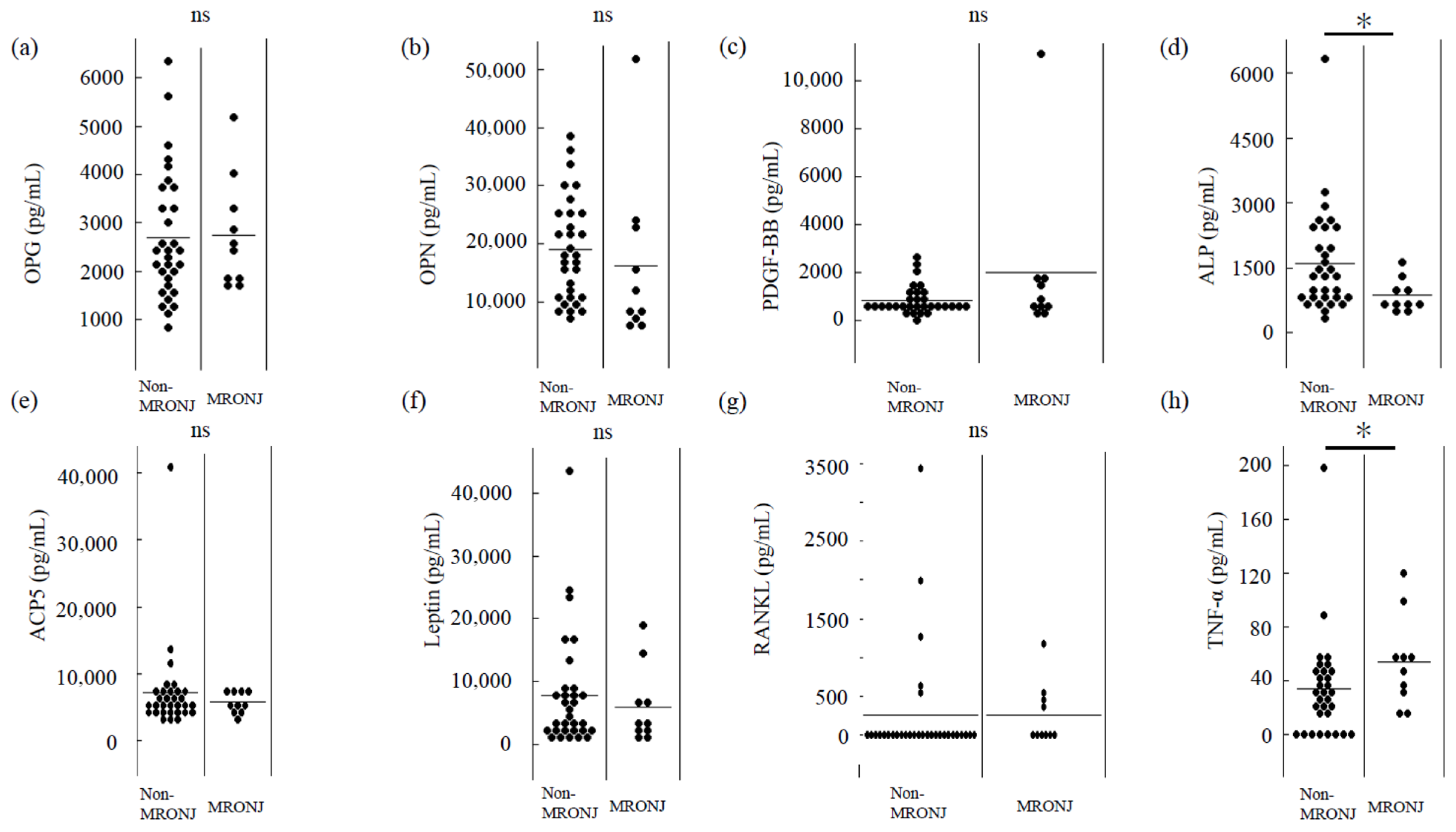 - Park, J.H.; Cho, S.; Kim, S.J.; Jeong, T.D.; Mun, Y.C.; Kim, J.W. Serum biomarkers for bisphosphonate-related osteonecrosis of the jaw: A prospective clinical study. Osteoporos. Int. 2022, 33, 367–377. [Google Scholar] [CrossRef]