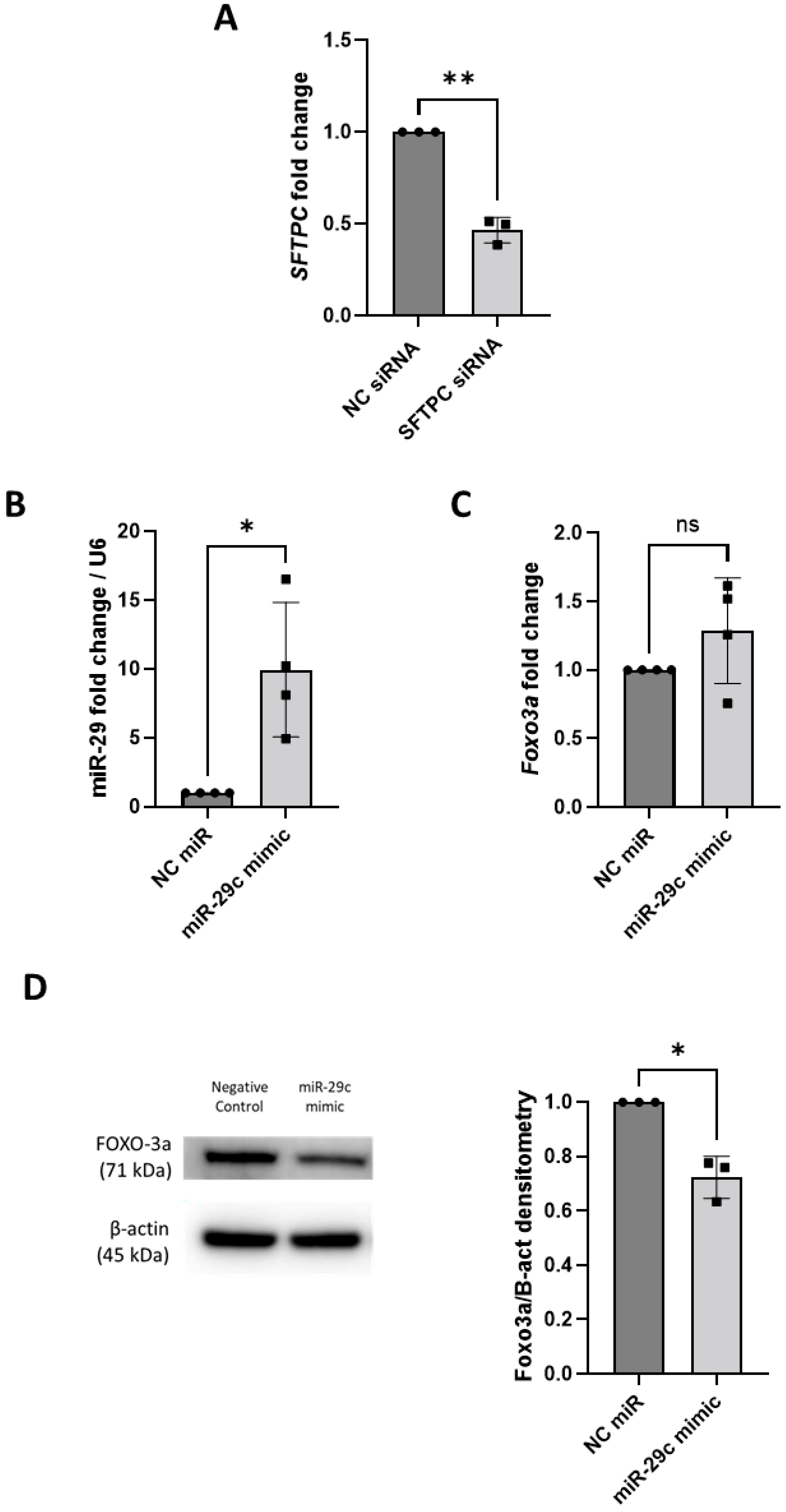 Figure 2. siRNAs and miRNAs can be transfected ‘in situ’ in iAT2 spheroids and decrease the expression of the target genes. (A) SFTPC mRNA levels measured after transfection of SFTPC siRNA (50 nM; 48 h) into iAT2 spheroids (n = 3 independent experiments, in triplicate). (B,C) miR-29c and its target FOXO3a levels and (D) FOXO3a protein expression measured after transfection of miR-29c mimics (50 nM; 48 h) into iAT2 spheroids (n = 3 independent experiments, at least, in triplicate for RNA; n = 3, in single for protein). Data are expressed as mean ± SD (NC siRNA-/mimic-transfected samples are set at 1). p-values are reported according to paired t-tests. p-values are reported on the graph as following: ns = not significant, * p ≤ 0.05, ** p < 0.01.